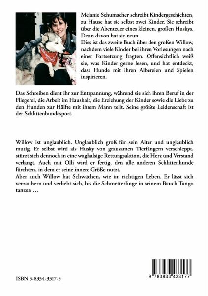 Willow ist unglaublich. Unglaublich groß für sein Alter und unglaublich mutig. Er selbst wird als Husky von grausamen Tierfängern verschleppt, stürzt sich dennoch in eine waghalsige Rettungsaktion, die Herz und Verstand verlangt. Auch mit Olli wird er fertig, den alle anderen Schlittenhunde fürchten, in dem er seine innere Größe nutzt. Aber auch Willow hat Schwächen, wie im richtigen Leben. Er lässt sich verzaubern und verliebt sich, bis die Schmetterlinge in seinem Bauch Tango tanzen....