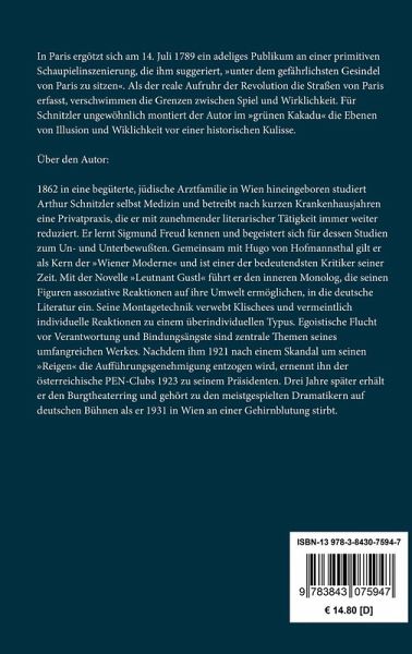 Arthur Schnitzler: Der grüne Kakadu. Groteske in einem Akt In Paris ergötzt sich am 14. Juli 1789 ein adeliges Publikum an einer primitiven Schaupielinszenierung, die ihm suggeriert, »unter dem gefährlichsten Gesindel von Paris zu sitzen«. Als der reale Aufruhr der Revolution die Straßen von Paris erfasst, verschwimmen die Grenzen zwischen Spiel und Wirklichkeit. Für Schnitzler ungewöhnlich montiert der Autor im »grünen Kakadu« die Ebenen von Illusion und Wiklichkeit vor einer historischen Kulisse. Entstanden 1898. Erstdruck: Berlin (Fischer), [1899]. Uraufführung am 01.03.1899, Burgtheater, Wien. Vollständige Neuausgabe mit einer Biographie des Autors. Herausgegeben von Karl-Maria Guth. Berlin 2015. Textgrundlage ist die Ausgabe: Arthur Schnitzler: Die Dramatischen Werke. Frankfurt a.M.: S. Fischer Verlag, 1962. Die Paginierung obiger Ausgabe wird in dieser Neuausgabe als Marginalie zeilengenau mitgeführt. Umschlaggestaltung von Thomas Schultz-Overhage unter Verwendung des Bildes: Jean-Pierre Houël, Sturm auf die Bastille, 1789. Gesetzt aus Minion Pro, 12 pt. Über den Autor: 1862 in eine begüterte, jüdische Arztfamilie in Wien hineingeboren studiert Arthur Schnitzler selbst Medizin und betreibt nach kurzen Krankenhausjahren eine Privatpraxis, die er mit zunehmender literarischer Tätigkeit immer weiter reduziert. Er lernt Sigmund Freud kennen und begeistert sich für dessen Studien zum Un- und Unterbewußten. Gemeinsam mit Hugo von Hofmannsthal gilt er als Kern der »Wiener Moderne« und ist einer der bedeutendsten Kritiker seiner Zeit. Mit der Novelle »Leutnant Gustl« führt er den inneren Monolog, die seinen Figuren assoziative Reaktionen auf ihre Umwelt ermöglichen, in die deutsche Literatur ein. Seine Montagetechnik verwebt Klischees und vermeintlich individuelle Reaktionen zu einem überindividuellen Typus. Egoistische Flucht vor Verantwortung und Bindungsängste sind zentrale Themen seines umfangreichen Werkes. Nachdem ihm 1921 nach einem Skandal um seinen »Reigen« die Aufführungsgenehmigung entzogen wird, ernennt ihn der österreichische PEN-Clubs 1923 zu seinem Präsidenten. Drei Jahre später erhält er den Burgtheaterring und gehört zu den meistgespielten Dramatikern auf deutschen Bühnen als er 1931 in Wien an einer Gehirnblutung stirbt.
