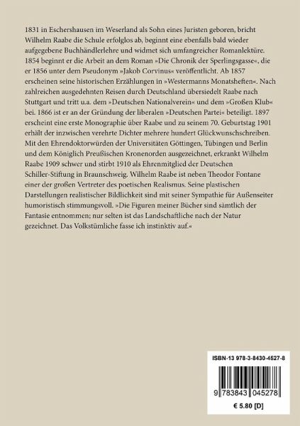Wilhelm Raabe: Der gute Tag / Ein Besuch / Auf dem Altenteil Der gute Tag: Entstanden im Februar 1875. Posthum erschienen in »Daheim«, Leipzig, 1912. Ein Besuch: Entstanden im Sommer 1884. Erstdruck in der »Illustrirten Zeitung«, Verlagshaus Johann Jacob Weber, leipzig, 1884. Auf dem Altenteil: Entstanden im November 1878. Erstdruck im »Deutschen Montagsblatt«, Rudolf Mosse, Berlin, 1878. Vollständige Neuausgabe mit einer Biographie des Autors. Herausgegeben von Karl-Maria Guth. Berlin 2015. Umschlaggestaltung von Thomas Schultz-Overhage unter Verwendung des Bildes: Abraham van Strij, Alte Frau am Fenster, um 1800. Gesetzt aus Minion Pro, 11 pt. Über den Autor: 1831 in Eschershausen im Weserland als Sohn eines Juristen geboren, bricht Wilhelm Raabe die Schule erfolglos ab, beginnt eine ebenfalls bald wieder aufgegebene Buchhändlerlehre und widmet sich umfangreicher Romanlektüre. 1854 beginnt er die Arbeit an dem Roman »Die Chronik der Sperlingsgasse«, die er 1856 unter dem Pseudonym »Jakob Corvinus« veröffentlicht. Ab 1857 erscheinen seine historischen Erzählungen in »Westermanns Monatsheften«. Nach zahlreichen ausgedehnten Reisen durch Deutschland übersiedelt Raabe nach Stuttgart und tritt u.a. dem »Deutschen Nationalverein« und dem »Großen Klub« bei. 1866 ist er an der Gründung der liberalen »Deutschen Partei« beteiligt. 1897 erscheint eine erste Monographie über Raabe und zu seinem 70. Geburtstag 1901 erhält der inzwischen verehrte Dichter mehrere hundert Glückwunschschreiben. Mit den Ehrendoktorwürden der Universitäten Göttingen, Tübingen und Berlin und dem Königlich Preußischen Kronenorden ausgezeichnet, erkrankt Wilhelm Raabe 1909 schwer und stirbt 1910 als Ehrenmitglied der Deutschen Schiller-Stiftung in Braunschweig. Wilhelm Raabe ist neben Theodor Fontane einer der großen Vertreter des poetischen Realismus. Seine plastischen Darstellungen realistischer Bildlichkeit sind mit seiner Sympathie für Außenseiter humoristisch stimmungsvoll. »Die Figuren meiner Bücher sind sämtlich der Fantasie entnommen; nur selten ist das Landschaftliche nach der Natur gezeichnet. Das Volkstümliche fasse ich instinktiv auf.«