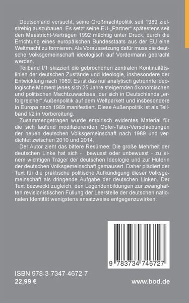 Deutschland versucht, seine Großmachtpolitik seit 1989 zielstrebig auszubauen. Es setzt seine EU-"Partner" spätestens seit den Maastricht-Verträgen 1992 mächtig unter Druck, durch die Errichtung eines europäischen Bundesstaats aus der EU eine Weltmacht zu formieren. Als Voraussetzung dafür muss die deutsche Volksgemeinschaft ideologisch auf Vordermann gebracht werden.Teilband I/1 skizziert die gebrochenen zentralen Kontinuitätslinien der deutschen Zustände und Ideologie, insbesondere der Entwicklung nach 1989. Es ist das nur analytisch getrennte ideologische Moment jenes sich 25 Jahre steigernden ökonomischen und politischen Machtzuwachses, der sich in Deutschlands "erfolgreicher" Außenpolitik auf dem Weltparkett und insbesondere in Europa nach 1989 manifestiert. Diese Außenpolitik ist als Teilband I/2 in Vorbereitung.Zusammengetragen wurde empirisch evidentes Material für die sich laufend modifizierenden Opfer-Täter-Verschiebungen der neuen deutschen Volksgemeinschaft nach 1989 und verdichtet zwischen 2010 und 2014.Der Autor zieht das bittere Resümee: Die große Mehrheit der deutschen Linke hat sich - bewusst oder unbewusst - zu einem wichtigen Träger der deutschen Ideologie und zur Hüterin der deutschen Volksgemeinschaft gemausert. Daher plädiert der Text für die praktische politische Aufkündigung dieser Volksgemeinschaft als dringende Aufgabe der deutschen Linken. Der Text bezweckt zugleich, den Legendenbildungen zur zwanghaften revisionistischen Füllungder Leerstelle der deutschen nationalen Identität wenigstensansatzweise entgegenzuwirken.