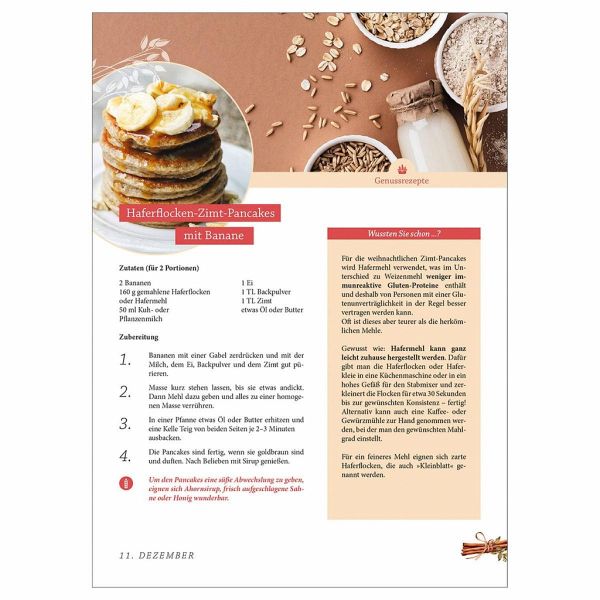Lange Zeit unterschätzt, gilt Hafer heute als heimisches Superfood. Das Getreide ist ein echter Alleskönner für die Gesundheit: Neben wertvollen Vitaminen, Eisen und Magnesium kann Hafer dabei helfen, den Blutzucker- und Cholesterinspiegel zu senken und den Darm zu schützen. Bereits Hildegard von Bingen, Paracelsus oder Kneipp wussten die Heilkraft des goldenen Korns zu schätzen. Der abwechslungsreiche Adventskalender zeigt Ihnen die ganze Vielfalt des Hafers. Von gesunden und leckeren Rezepten wie Hafer-Apfel-Smoothie, Haferflocken-Zimt-Pancakes oder deftige Kartoffel-Hafer-Puffer bis zur traditionellen Haut- und Haarkur kommen Sie von Kopf bis Fuß gestärkt durch den Advent!- mit Hafer gesund und lecker durch den Advent- mit traditionellen Rezepten aus Klöstern- gelingsichere Rezepte und Anwendungen