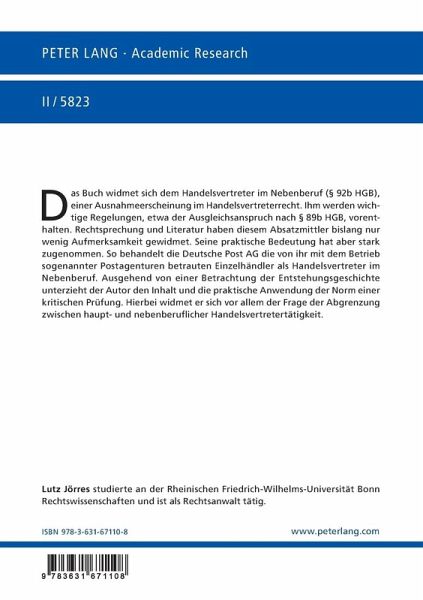89b HGB, vorenthalten. Rechtsprechung und Literatur haben diesem Absatzmittler bislang nur wenig Aufmerksamkeit gewidmet. Seine praktische Bedeutung hat aber stark zugenommen. So behandelt die Deutsche Post AG die von ihr mit dem Betrieb sogenannter Postagenturen betrauten Einzelhändler als Handelsvertreter im Nebenberuf. Ausgehend von einer Betrachtung der Entstehungsgeschichte unterzieht der Autor den Inhalt und die praktische Anwendung der Norm einer kritischen Prüfung. Hierbei widmet er sich vor allem der Frage der Abgrenzung zwischen haupt- und nebenberuflicher Handelsvertretertätigkeit.