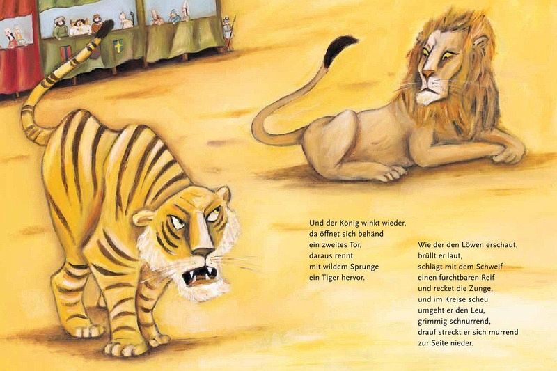 »Vor seinem Löwengarten, das Kampfspiel zu erwarten, saß König Franz ...« Und bald schon balgen sich brüllende Leoparden, Löwen und Tiger vor dem erlauchten Publikum um die Wette. Plötzlich aber fällt Fräulein Kunigundes Handschuh mitten zwischen die hungrigen Katzen. Eine willkommene Gelegenheit für die hochmütige Dame, ihren Herzensritter Delorges auf die Probe zu stellen: Zum Beweis seiner Liebe soll er in die sprichwörtliche Höhle des Löwen hinabsteigen und ihr den Handschuh zurückbringen ...