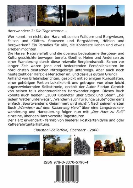 Wer kennt ihn nicht, den Harz mit seinen Wäldern und Bergwiesen, Felsen und Klüften, Stauseen und Bergstädten, Höhlen und Bergwerken? Ein Paradies für alle, die Kontraste lieben und etwas erleben möchten.Die Harzer Naturvielfalt und die überaus bedeutsame Bergbau- und Kulturgeschichte bewogen bereits Goethe, Heine und Andersen zu einer Wanderung durch diese reizvolle Berglandschaft. Schon vor langer Zeit waren jene drei bedeutenden Persönlichkeiten im nördlichsten deutschen Mittelgebirge unterwegs. Aber auch noch heute zieht der Harz die Menschen an, und das aus gutem Grund!Anhand von Erlebnisberichten, gespickt mit so einigen Kuriositäten, einer gehörigen Portion Lokalkolorit und getragen von einer leicht augenzwinkernden Selbstironie, erzählt der Autor Florian Genrich von seinen teils abenteuerlichen Harzwanderungen. Dieses Buch könnte auch heißen: "1000 Kilometer über Stock und Stein", "Bei jedem Wetter unterwegs", "Wandern auch für junge Leute" oder ganz einfach "Sportwandern: Gejammert wird nicht!".Nach seinem ersten Buch "Wandern auf dem Kaiserweg Harz" über eine Langstreckenwanderung und Harzquerung folgen nun mit "Der Harz zu Fuß" einzelne, über den Harz verteilte Tagestouren.Der Harz erwandert - fernab von biederer Postkartenidylle und öder Kaffeefahrtunterhaltung.Clausthal-Zellerfeld, Oberharz - 2008