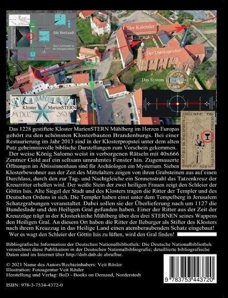 Das 1228 gestiftete Kloster MarienSTERN Mühlberg im Herzen Europas gehört zu den schönsten Klosterbauten Brandenburgs. Bei einer Restaurierung im Jahr 2013 sind in der Klosterpropstei unter dem alten Putz geheimnisvolle biblische Darstellungen zum Vorschein gekommen. Der weise König Salomo weist mit verborgenen Rätseln mit 40x666 Zentner Gold auf ein seltsam umrahmtes Fenster hin. Zugemauerte Öffnungen im Äbtissinnenhaus sind für Archäologen ein Mysterium. Sieben Klosterbewohner aus der Zeit des Mittelalters zeigen von ihren Grabsteinen aus auf einen Durchlass, durch den zur Tag- und Nachtgleiche ein Sonnenstrahl das Tatzenkreuz der Kreuzritter erhellen wird. Der weiße Stein der zwei heiligen Frauen zeigt den Schleier der ägyptischen Göttin Isis. Der alte Altar der Klosterkirche offenbart vier Becher an einer Stelle, an der es nur einen Gral geben sollte! Alte Siegel der Stadt und des Klosters tragen die Ritter der Templer und des Deutschen Ordens in sich. Die Templer haben einstunter dem Tempelberg in Jerusalem Schatzgrabungen veranstaltet. Dabei sollen sie der Überlieferung nach um 1127 die Bundeslade und den Heiligen Gral gefunden haben. Einer der Ritter aus der Zeit der Kreuzzüge trägt in der Klosterkirche Mühlberg über den drei STERNEN seines Wappens den Heiligen Gral. An diesem Ort haben die Ritter der Ileburger als Stifter des Klosters nach ihrem Kreuzzug in das Heilige Land einen atemberaubenden Schatz eingebaut! Wer es wagt den Schleier der Göttin Isis zu lüften, wird die verborgenen Geheimnisse enthüllen und den Gipfel des Wissens erreichen! Wer die Zeichen deuten kann, wird den Gral finden! Den Gral, den Jesus beim Abendmahl symbolisch seinen 12 Jüngern in ihre Runde gereicht hat! Eingeweihte Persönlichkeiten unter den Betreibern des Klosters Mühlberg und der nahen Stadt Wittenberg kannten über Generationen und damit über Jahrhunderte hinweg in einem Heiligen Geist alte Geheimnisse aus der Zeit der frühen Antike, die den Verlauf der Menschheitsgeschichte wesentlich beeinflusst haben! Ähnliche mysteriöse Zeichen haben die Templer und ihre Nachfahren in Rosslyn Chapel in Schottland, in Frankreich, in Portugal und in Vizinada in Kroatien hinterlassen. Das verloren geglaubte Wissen wird durch das alte Kloster mit dem STERN im Namen wieder lebendig! Beschrieben wird ein vor aller Augen unsichtbares System: Das Werkzeug Gottes! Paperback - SW - Kl. Schrift - 1124 Schwarz- Weiß- Bilder/Zeichnungen auf 217 Tafeln - Empfohlen wird eine Farbvariante!