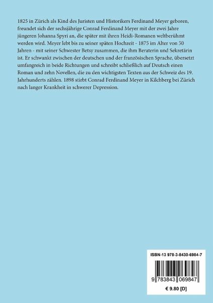 1825 in Zürich als Kind des Juristen und Historikers Ferdinand Meyer geboren, freundet sich der sechsjährige Conrad Ferdinand Meyer mit der zwei Jahre jüngeren Johanna Spyri an, die später mit ihren Heidi-Romanen weltberühmt werden wird. Meyer lebt bis zu seiner späten Hochzeit - 1875 im Alter von 50 Jahren - mit seiner Schwester Betsy zusammen, die ihm Beraterin und Sekretärin ist. Er schwankt zwischen der deutschen und der französischen Sprache, übersetzt umfangreich in beide Richtungen und schreibt schließlich auf Deutsch einen Roman und zehn Novellen, die zu den wichtigsten Texten aus der Schweiz des 19. Jahrhunderts zählen. 1898 stirbt Conrad Ferdinand Meyer in Kilchberg bei Zürich nach langer Krankheit in schwerer Depression.