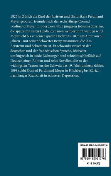 1825 in Zürich als Kind des Juristen und Historikers Ferdinand Meyer geboren, freundet sich der sechsjährige Conrad Ferdinand Meyer mit der zwei Jahre jüngeren Johanna Spyri an, die später mit ihren Heidi-Romanen weltberühmt werden wird. Meyer lebt bis zu seiner späten Hochzeit - 1875 im Alter von 50 Jahren - mit seiner Schwester Betsy zusammen, die ihm Beraterin und Sekretärin ist. Er schwankt zwischen der deutschen und der französischen Sprache, übersetzt umfangreich in beide Richtungen und schreibt schließlich auf Deutsch einen Roman und zehn Novellen, die zu den wichtigsten Texten aus der Schweiz des 19. Jahrhunderts zählen. 1898 stirbt Conrad Ferdinand Meyer in Kilchberg bei Zürich nach langer Krankheit in schwerer Depression.