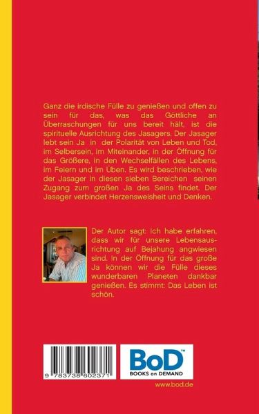 Ganz die irdische Fülle zu genießen und offen zu sein für das, was das Göttliche an Überraschungen für uns bereit hält, ist die spirituelle Ausrichtung des Jasagers. Der Jasager lebt sein Ja in der Polarität von Leben und Tod, im Selbersein, im Miteinander, in der Öffnung für das Größere, in den Wechselfällen des Lebens, im Feiern und im Üben. Es wird beschrieben, wie der Jasager in diesen sieben Bereichen seinen Zugang zum großen Ja des Seins findet. Der Jasager übt sich darin, sich selber und seinen Ort im großen Wirken des geheimnisvollen, überraschenden Gottes anzunehmen. Der Jasager erfreut sich an der Fülle des Irdischen, so wie es für ihn in jedem Moment erfahrbar ist. Dem Jasager liegt daran, die Weisheit seines Herzens mit dem Denken in Einklang zu bringen.