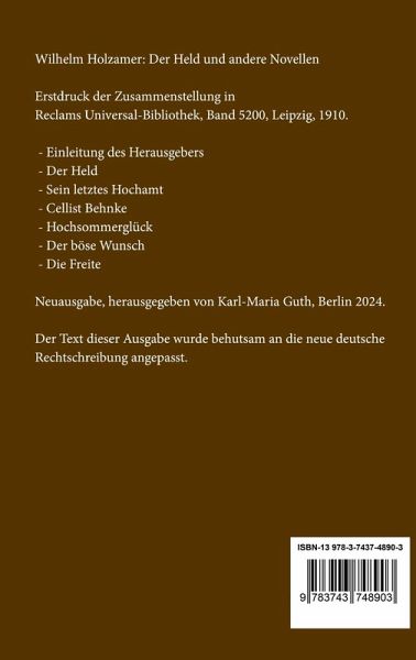 Wilhelm Holzamer: Der Held und andere Novellen Erstdruck der Zusammenstellung in Reclams Universal-Bibliothek, Band 5200, Leipzig, 1910. Inhaltsverzeichnis: Der Held und andere Novellen. Einleitung des Herausgebers. Der Held. Sein letztes Hochamt. Cellist Behnke. Hochsommerglück. Der böse Wunsch. Die Freite. Neuausgabe, herausgegeben von Karl-Maria Guth, Berlin 2024. Der Text dieser Ausgabe wurde behutsam an die neue deutsche Rechtschreibung angepasst. Umschlagabbildung: Wilhelm Holzamer, um 1904, aus: Dichtung und Dichter der Zeit: eine Schilderung der deutschen Literatur der letzten Jahrzehnte. Leipzig, Voigtländer, 1916 Gesetzt aus der Minion Pro, 11 pt. Henricus - Edition Deutsche Klassik GmbH