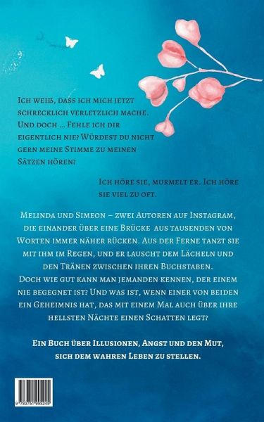Melinda wirkt viel lebensfroher, lockerer, lustiger und voller Optimismus. Aber auch das täuscht. Sie zeigt Simeon während der Gespräche immer mehr von der „echten Melinda, die traurig ist, weil ihre Ehe kaputt ist, die an ihren Fähigkeiten als gute Autorin manchmal zweifelt, weil Liebesromane ja keinen guten Ruf haben, die die starke Frau nach außen gibt, statt einfach mal zu sagen: Ich bin traurig“. Melinda gibt in diesen Momenten so viel von sich preis und weiß genau bei Simeon kommt es richtig an.