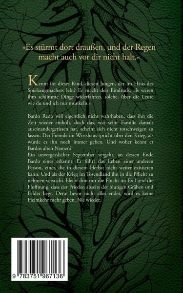 »Kennt ihr dieses Kind, diesen Jungen, der im Haus des Spielzeugmachers lebt? Er macht den Eindruck, als wären ihm schlimme Dinge widerfahren, solche, über die Leute wie du und ich nur munkeln.«Bardo Redo will eigentlich nicht wahrhaben, dass ihn die Zeit wieder einholt, doch das, was seine Familie damals auseinandergerissen hat, scheint sich nicht totschweigen zu lassen. Der Fremde im Wirtshaus spricht über den Krieg, als würde es ihn noch immer geben. Und woher kennt er Bardos alten Namen?Ein unvergesslicher September vergeht, an dessen Ende Bardo eines erkennt: Er führt das Leben einer anderen Person, einer, die in diesem Herbst nicht weiter existieren kann. Und als der Krieg im Tosendland ihn in die Pflicht zu nehmen versucht, bleibt ihm nur die Flucht ins Exil und die Hoffnung, dass der Frieden abseits der blutigen Gräben und Felder liegt. Denn bevor nicht alles endet, wird es keine Heimkehr mehr geben. Nie wieder.Fantastischer Roman über das Erwachsenwerden, ab 14 Jahren.
