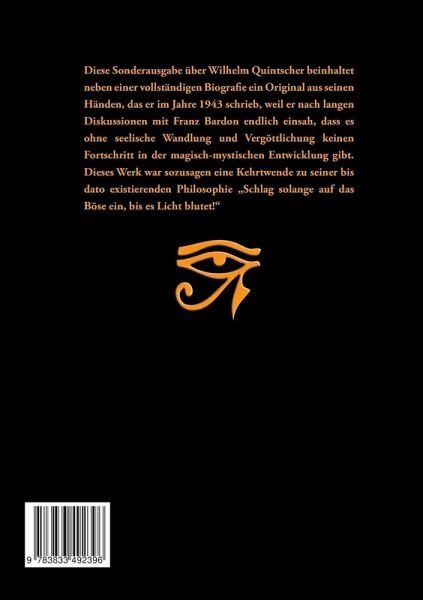 Diese Sonderausgabe über Wilhelm Quintscher beinhaltet neben einer vollständigen Biografie ein Original aus seinen Händen, das er im Jahre 1943 schrieb, weil er nach langen Diskussionen mit Franz Bardon endlich einsah, dass es ohne seelische Wandlung und Vergöttlichung keinen Fortschritt in der magisch-mystischen Entwicklung gibt. Dieses Werk war sozusagen eine Kehrtwende zu seiner bis dato existierenden Philosophie "Schlag solange auf das Böse ein, bis es Licht blutet!"