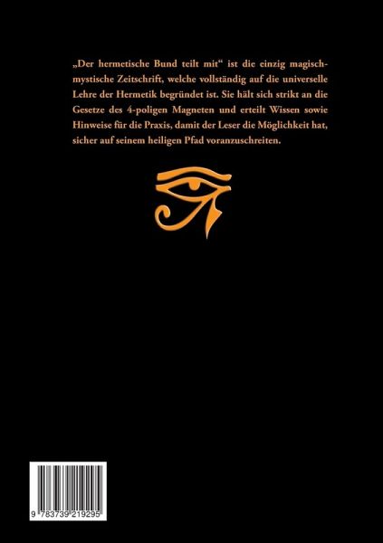 "Der hermetische Bund teilt mit" ist die einzig magisch-mystische Zeitschrift, welche vollständig auf die universelle Lehre der Hermetik begründet ist. Sie hält sich strikt an die Gesetze des 4-poligen Magneten und erteilt Wissen sowie Hinweise für die Praxis, damit der Leser die Möglichkeit hat, sicher auf seinem heiligen Pfad voranzuschreiten.Vorwort:1. Beschwörungs-Bücher2. Gregorius und sein Buch "Die magische Erweckung der Chakra im Ätherkörper des Menschen"3. Über Rituale, Gesten, Mudras und Zeremonien4. Ekstase - Teil VI5. Khan - Hermetische Aufsätze6. Wege zur Erleuchtung7. Flugweg zu Gott8. Kloster in China9. Bemerkungen des großen Sufi Inhayat Khan10. Aus den Papieren eines ungenannten Philosophen11. Die vier Pflichten des Derwisches12. Die Meister der Weisheit13. Buddhistische Lehren14. Die buddhistische Religion in Japan15. Die obskure Person des Walter Jantschik16. Winke für den Praktiker17. Mysterium18. Das Geheimnis des spirituellen Fortschrittes19. Buddhas energetische Moral20. Das Gesetz der Ruhe21. Die stoffliche und die geistige Welt22. Der Zusammenhang von Ton und Farbe23. Tattwische Heilkräfte24. Gott - Götter - Genien25. Die wahren Namen der Mondgenien26. Ein langweiliger Übungsalltag27. Durch Ohnmacht in die Zuversicht28. Der Teufelspakt