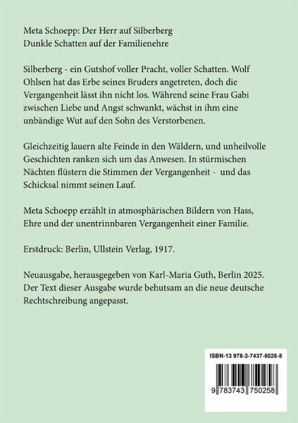 Meta Schoepp: Der Herr auf Silberberg. Dunkle Schatten auf der Familienehre Silberberg - ein Gutshof voller Pracht, voller Schatten. Wolf Ohlsen hat das Erbe seines Bruders angetreten, doch die Vergangenheit lässt ihn nicht los. Während seine Frau Gabi zwischen Liebe und Angst schwankt, wächst in ihm eine unbändige Wut auf den Sohn des Verstorbenen. Gleichzeitig lauern alte Feinde in den Wäldern, und unheilvolle Geschichten ranken sich um das Anwesen. In stürmischen Nächten flüstern die Stimmen der Vergangenheit - und das Schicksal nimmt seinen Lauf. Meta Schoepp erzählt in atmosphärischen Bildern von Hass, Ehre und der unentrinnbaren Vergangenheit einer Familie. Erstdruck: Berlin, Ullstein Verlag, 1917. Neuausgabe, herausgegeben von Karl-Maria Guth, Berlin 2025. Der Text dieser Ausgabe wurde behutsam an die neue deutsche Rechtschreibung angepasst. Gesetzt aus der Minion Pro, 11 pt. Henricus - Edition Deutsche Klassik GmbH