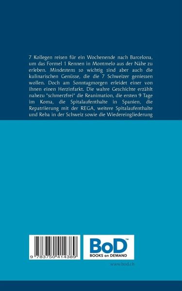 7 Kollegen reisen für ein Wochenende nach Barcelona, um das Formel 1 Rennen in Montmelo aus der Nähe zu erleben. Mindestens so wichtig sind aber auch die kulinarischen Genüsse, die die 7 Schweizer geniessen wollen. Doch am Sonntagmorgen erleidet einer von ihnen einen Herzinfarkt. Die wahre Geschichte erzählt nahezu "schmerzfrei" die Reanimation, die ersten 9 Tage im Koma, die Spitalaufenthalte in Spanien, die Repatriierung mit der REGA, weitere Spitalaufenthalte und Reha in der Schweiz sowie die Wiedereingliederung ins Berufsleben.