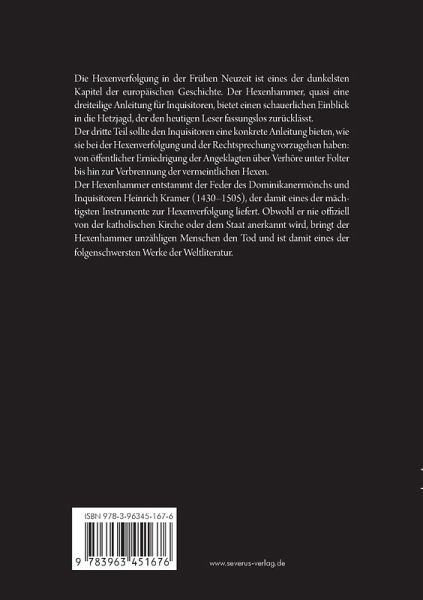 Die Hexenverfolgung war eine der blutigsten Episoden der europäischen Geschichte. Was veranlasste die Tötung unzähliger Unschuldiger, und worauf stützten sich die Ankläger? Der Hexenhammer von Heinrich Kramer aus dem Jahre 1486 gilt als das inoffizielle Handbuch der Hexenjäger. Er bietet einen einzigartigen Einblick in die grausamen Machenschaften der Inquisition. Trotz der weiten Verbreitung des Hexenhammers wurde er nie offiziell von Kirche oder Staat anerkannt. Der erste Teil definiert, wer aus welchen Gründen als Hexe angesehen werden muss. Der zweite Teil widmet sich den magischen Praktiken und den Unterschieden der Geschlechter. Der dritte Teil beschreibt die Gesetze und den Ablauf bei Hexenprozessen. Heinrich Kramer alias Heinrich Institoris war ein Dominikanermönch und lebte von 1430 bis 1505. Der Autor des Hexenhammers machte sich einen Namen als Hexentheoretiker und Inquisitor. Übersetzt und kommentiert wurde diese Ausgabe von Johann Wilhelm Richard Schmidt (1866-1939), der als Indologe und Übersetzer tätig war.
