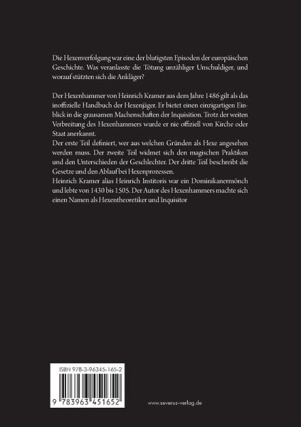 Die Hexenverfolgung war eine der blutigsten Episoden der europäischen Geschichte. Was veranlasste die Tötung unzähliger Unschuldiger, und worauf stützten sich die Ankläger? Der Hexenhammer von Heinrich Kramer aus dem Jahre 1486 gilt als das inoffizielle Handbuch der Hexenjäger. Er bietet einen einzigartigen Einblick in die grausamen Machenschaften der Inquisition. Trotz der weiten Verbreitung des Hexenhammers wurde er nie offiziell von Kirche oder Staat anerkannt. Der erste Teil definiert, wer aus welchen Gründen als Hexe angesehen werden muss. Der zweite Teil widmet sich den magischen Praktiken und den Unterschieden der Geschlechter. Der dritte Teil beschreibt die Gesetze und den Ablauf bei Hexenprozessen. Heinrich Kramer alias Heinrich Institoris war ein Dominikanermönch und lebte von 1430 bis 1505. Der Autor des Hexenhammers machte sich einen Namen als Hexentheoretiker und Inquisitor. Übersetzt und kommentiert wurde diese Ausgabe von Johann Wilhelm Richard Schmidt (1866-1939), der als Indologe und Übersetzer tätig war.