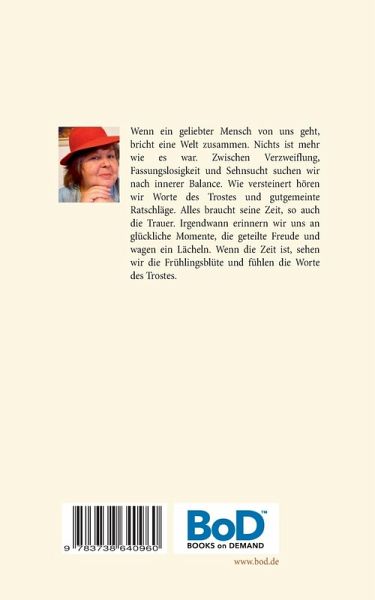 Wenn ein geliebter Mensch von uns geht, bricht eine Welt zusammen. Nichts ist mehr wie es war. Zwischen Verzweiflung, Fassungslosigkeit und Sehnsucht suchen wir nach innerer Balance. Wie versteinert hören wir Worte des Trostes und gutgemeinte Ratschläge. Alles braucht seine Zeit, so auch die Trauer. Irgendwann erinnern wir uns an glückliche Momente, die geteilte Freude und wagen ein Lächeln. Wenn die Zeit ist, sehen wir die Frühlingsblüte und fühlen die Worte des Trostes.