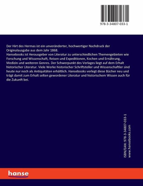 Der Hirt des Hermas ist ein unveränderter, hochwertiger Nachdruck der Originalausgabe aus dem Jahr 1868.Hansebooks ist Herausgeber von Literatur zu unterschiedlichen Themengebieten wie Forschung und Wissenschaft, Reisen und Expeditionen, Kochen und Ernährung, Medizin und weiteren Genres. Der Schwerpunkt des Verlages liegt auf dem Erhalt historischer Literatur. Viele Werke historischer Schriftsteller und Wissenschaftler sind heute nur noch als Antiquitäten erhältlich. Hansebooks verlegt diese Bücher neu und trägt damit zum Erhalt selten gewordener Literatur und historischem Wissen auch für die Zukunft bei.