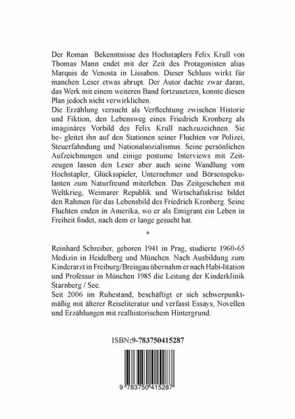 Der Roman Bekenntnisse des Hochstaplers Felix Krull von Thomas Mann endet mit der Zeit des Protagonisten alias Marquis de Venosta in Lissabon. Dieser Schluss wirkt für manchen Leser etwas abrupt. Der Autor dachte zwar daran, das Werk mit einem weiteren Band fortzusetzen, konnte diesen Plan jedoch nicht verwirklichen. Die Erzählung versucht als Verflechtung zwischen Historie und Fiktion, den Lebensweg eines Friedrich Kronberg als imaginäres Vorbild des Felix Krull nachzuzeichnen. Sie begleitet ihn auf den Stationen seiner Fluchten vor Polizei, Steuerfahndung und Nationalsozialismus. Seine persönlichen Aufzeichnungen und einige postume Interviews mit Zeitzeugen lassen den Leser aber auch seine Wandlung vom Hochstapler, Glücksspieler, Unternehmer und Börsenspeku-lanten zum Naturfreund miterleben. Das Zeitgeschehen mit Weltkrieg, Weimarer Republik und Wirtschaftskrise bildet den Rahmen für das Lebensbild des Friedrich Kronberg. Seine Fluchten enden in Amerika, wo er als Emigrant einLeben in Freiheit findet, nach dem er lange gesucht hat.