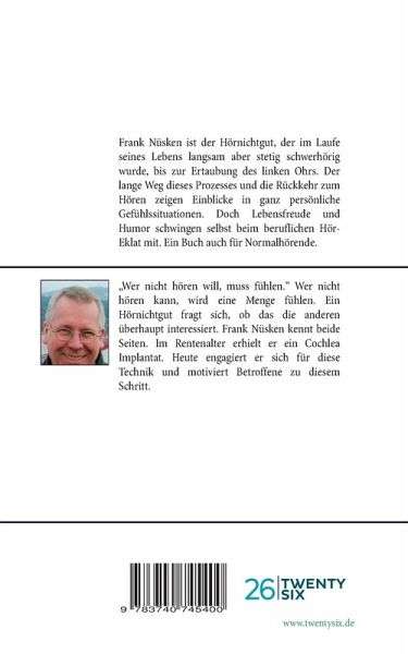 Frank Nüsken ist der Hörnichtgut, der im Laufe seines Lebens langsam aber stetig schwerhörig wurde, bis zur Ertaubung des linken Ohrs. Der lange Weg dieses Prozesses und die Rückkehr zum Hören zeigen Einblicke in ganz persönliche Gefühlssituationen. Doch Lebensfreude und Humor schwingen selbst beim beruflichen Hör-Eklat mit. Ein Buch auch für Normalhörende.