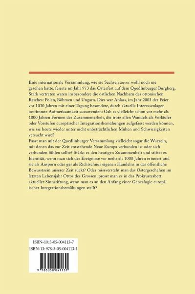 Eine internationale Versammlung, wie sie Sachsen zuvor wohl noch nie gesehen hatte, feierte im Jahr 973 das Osterfest auf dem Quedlinburger Burgberg. Stark vertreten waren insbesondere die östlichen Nachbarn des ottonischen Reiches: Polen, Böhmen und Ungarn. Dies war Anlass, im Jahr 2003 der Feier vor 1030 Jahren mit einer Tagung besondere, durch aktuelle Interessenlagen bestimmet Aufmerksamkeit zuzuwenden: Gab es vielleicht schon vor mehr als 1000 Jahren Formen der Zusammenarbeit, die trotz allen Wandels als Vorläufer oder Vorstufen europäischer Integrationsbemühungen aufgefasst werden können, wie sie heute wieder unter nicht unbeträchtlichen Mühen und Schwierigkeiten versucht wird? Fasst man mit der Quedlinburger Versammlung vielleicht sogar die Wurzeln, mit denen das zur Zeit entstehende Neue Europa verbunden ist oder sich verbunden fühlen sollte? Stärkt es den heutigen Zusammenhalt und stiftet es Identität, wenn man sich der Ereignisse vor mehr als 1000 Jahren erinnert und sie als Ansporn oder gar als Richtschnur eigenen Handelns in das öffentliche Bewusstsein unserer Zeit rückt? Oder missversteht man das Ostergeschehen im letzten Lebensjahr Ottos des Grossen, presst man es in das Prokrustesbett aktueller Sinnstiftung, wenn man es an den Anfang einer Genealogie europäischer Integrationsbemühungen stellt?