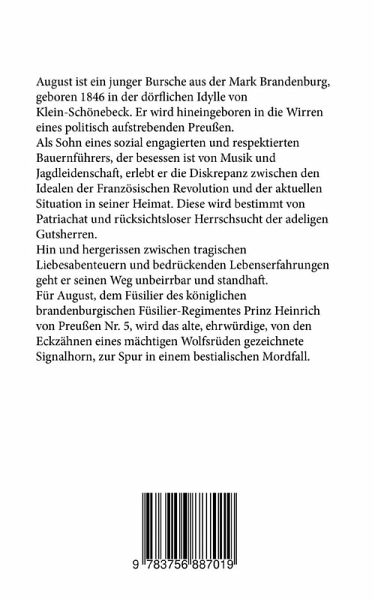 August ist ein junger Bursche aus der Mark Brandenburg, geboren 1846 in der dörflichen Idylle von Klein-Schönebeck. Seine Situation in der Heimat wird bestimmt von Patriarchat und rücksichtsloser Herrschsucht der adligen Gutsherren. Hin- und hergerissen zwischen tragischen Liebesabenteuern und bedrückenden Lebenserfahrungen geht er seinen Weg. Als Soldat des königlichen brandenburgischen Füsilier-Regimentes Prinz Heinrich von Preussen Nr. 5 wird das alte, ehrwürdige, von den Eckzähnen eines mächtigen Wolfsrüden gezeichnete, Signalhorn zur Spur in einem vorgegebenen, rücksichtslosen Überlebenskampf.