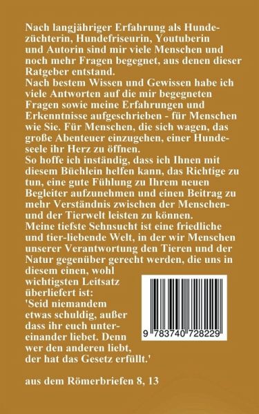 Nach langjähriger Erfahrung als Hundezüchterin, Hundefriseurin, Youtuberin und Autorin sind mir viele Menschen und noch mehr Fragen begegnet, aus denen dieser Ratgeber entstand. Nach bestem Wissen und Gewissen habe ich viele Antworten auf die mir begegneten Fragen sowie meine Erfahrungen und Erkenntnisse aufgeschrieben - für Menschen wie Sie. Für Menschen, die sich wagen, das große Abenteuer einzugehen, einer Hundeseele ihr Herz zu öffnen.So hoffe ich inständig, dass ich Ihnen mit diesem Büchlein helfen kann, das Richtige zu tun, eine gute Fühlung zu Ihrem neuen Begleiter aufzunehmen und einen…mehr