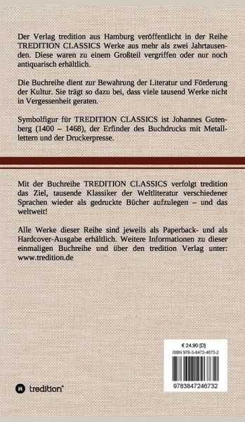 Diese Hardcover-Ausgabe ist Teil der TREDITION CLASSICS. Der Verlag tredition aus Hamburg veröffentlicht in der Buchreihe TREDITION CLASSICS Werke aus mehr als zwei Jahrtausenden. Diese waren zu einem Großteil vergriffen oder nur noch antiquarisch erhältlich. Mit TREDITION CLASSICS verfolgt tredition das Ziel, tausende Klassiker der Weltliteratur verschiedener Sprachen wieder als gedruckte Bücher zu verlegen und das weltweit! Die Buchreihe dient zur Bewahrung der Literatur und Förderung der Kultur. Sie trägt so dazu bei, dass viele tausend Werke nicht in Vergessenheit geraten.