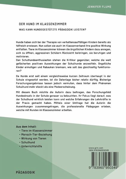 Nachdem sich Hunde für die Therapie von verhaltensauffälligen Kindern als hilfreich erwiesen, sollen sie nun auch im Klassenverband ihre positive Wirkung entfalten. Tiere im Klassenzimmer sollen sich beruhigend auswirken, motivieren, die ängstlichen Kindern dazu anregen, sich zu öffnen und den aggressiven Schülern Rücksicht beibringen. Den Schulhundeenthusiasten stehen die Kritiker gegenüber, welche die weit gefächerten positiven Auswirkungen der Schulhunde in Zweifel ziehen. Ängstliche Kinder ermutigen und Rabauken bremsen, wie soll das gleichzeitig funktionieren?Da Hunde erst seit einem vergleichsweise kurzen Zeitraum überhaupt in der Schule eingesetzt werden, ist die Datenlage bisher relativ dürftig. Bisherige Forschungsergebnisse lassen jedoch vermuten, dass hinter dem Phänomen Schulhund mehr steckt als eine Modeerscheinung. Mit diesem Buch möchte die Autorin dazu beitragen, das Forschungsfeld Hundeeinsatz in der Schule genauer zu beleuchten. Ihr Fokus liegt darauf, was der Schulhund wirklich leisten kann und welche Erfahrungen die Lehrkräfte in der Praxis gemacht haben. Mittels einer Umfrage hat die Autorin die Auswirkungen zusammengetragen, die professionelle Pädagogen, die mit Hunden im Klassenzimmer arbeiten, erleben.Aus dem Inhalt:- Tiere im Klassenzimmer- Mensch-Tier-Beziehung- Wirkung von Tieren- Schulhund- Unterrichtshilfe