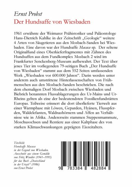 1961 erwähnte der Weimarer Prähistoriker und Paläontologe Hans-Dietrich Kahlke in der Zeitschrift "Geologie" weitere 4 Arten von Säugetieren aus den Mosbach-Sanden bei Wiesbaden. Eine davon war der Hundsaffe Macaca sp. Der seltene Originalfund eines Oberkieferfragmentes mit Zähnen des Hundsaffen aus Mosbach wird im Frankfurter Senckenberg-Museum aufbewahrt. Der Text über jenes Tier im vorliegenden Buch "Der Hundsaffe von Wiesbaden" stammt aus dem Buch "Wiesbaden vor 600.000 Jahren". Darin werden unter anderem auch umstrittene Hinterlassenschaften von Frühmenschen aus den Mosbach-Sanden beschrieben. Die nach dem ehemaligen Dorf Mosbach zwischen Wiesbaden und Biebrich benannten Flussablagerungen des Ur-Mains und Ur-Rheins gelten als eine der bedeutendsten Fossilienfundstätten Europas. Teilweise erinnert die dort überlieferte Tierwelt aus einer Warmphase mit Löwen, Geparden, Hyänen, Flusspferden, Waldelefanten, Waldnashörnern und Affen an Verhältnisse wie in Afrika. Andererseits stammen Steppenmammute, Moschus-ochsen und Rentiere aus einer Kaltphase des von starken Klimaschwankungen geprägten Eiszeitalters.