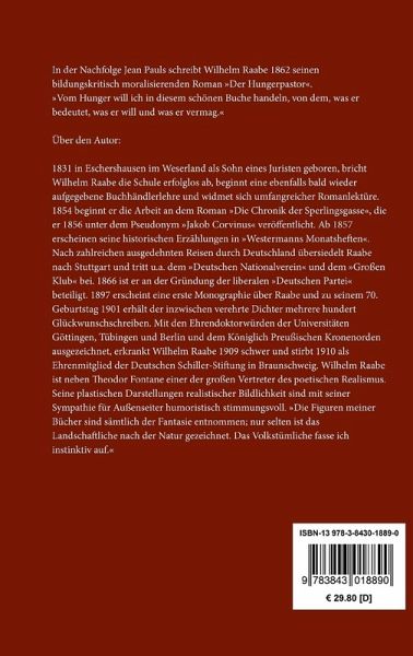 Wilhelm Raabe: Der Hungerpastor In der Nachfolge Jean Pauls schreibt Wilhelm Raabe 1862 seinen bildungskritisch moralisierenden Roman »Der Hungerpastor«. »Vom Hunger will ich in diesem schönen Buche handeln, von dem, was er bedeutet, was er will und was er vermag.« Entstanden 1862/63. Erstdruck in: Deutsche Roman-Zeitung (Berlin), 1. Jg., Nr. 1¿12, Nov. 1863 ¿ März 1864. Vollständige Neuausgabe mit einer Biographie des Autors. Herausgegeben von Karl-Maria Guth. Berlin 2013. Textgrundlage ist die Ausgabe: Wilhelm Raabe: Ausgewählte Werke in sechs Bänden. Herausgegeben von Peter Goldammer und Helmut Richter, Berlin und Weimar: Aufbau, 1964¿1966. Die Paginierung obiger Ausgabe wird in dieser Neuausgabe als Marginalie zeilengenau mitgeführt. Umschlaggestaltung von Thomas Schultz-Overhage unter Verwendung des Bildes: Carl Spitzweg, Der Alchimist, 1847. Gesetzt aus Minion Pro, 11 pt. Über den Autor: 1831 in Eschershausen im Weserland als Sohn eines Juristen geboren, bricht Wilhelm Raabe die Schule erfolglos ab, beginnt eine ebenfalls bald wieder aufgegebene Buchhändlerlehre und widmet sich umfangreicher Romanlektüre. 1854 beginnt er die Arbeit an dem Roman »Die Chronik der Sperlingsgasse«, die er 1856 unter dem Pseudonym »Jakob Corvinus« veröffentlicht. Ab 1857 erscheinen seine historischen Erzählungen in »Westermanns Monatsheften«. Nach zahlreichen ausgedehnten Reisen durch Deutschland übersiedelt Raabe nach Stuttgart und tritt u.a. dem »Deutschen Nationalverein« und dem »Großen Klub« bei. 1866 ist er an der Gründung der liberalen »Deutschen Partei« beteiligt. 1897 erscheint eine erste Monographie über Raabe und zu seinem 70. Geburtstag 1901 erhält der inzwischen verehrte Dichter mehrere hundert Glückwunschschreiben. Mit den Ehrendoktorwürden der Universitäten Göttingen, Tübingen und Berlin und dem Königlich Preußischen Kronenorden ausgezeichnet, erkrankt Wilhelm Raabe 1909 schwer und stirbt 1910 als Ehrenmitglied der Deutschen Schiller-Stiftung in Braunschweig. Wilhelm Raabe ist neben Theodor Fontane einer der großen Vertreter des poetischen Realismus. Seine plastischen Darstellungen realistischer Bildlichkeit sind mit seiner Sympathie für Außenseiter humoristisch stimmungsvoll. »Die Figuren meiner Bücher sind sämtlich der Fantasie entnommen; nur selten ist das Landschaftliche nach der Natur gezeichnet. Das Volkstümliche fasse ich instinktiv auf.«