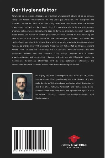 Warum ist es so schwer, strategische Initiativen umzusetzen? Warum ist es so schwer, "fertig" zu werden? Unternehmen, die ihre Ziele gut umsetzen, sind erfolgreich und florieren. Und warum? Weil sie für den Erfolg bereit und konditioniert sind. Sie können etwas umsetzen, weil sie dazu bereit sind. Die Menschen, die in diesen Unternehmen arbeiten, wollen etwas erreichen, sind dazu in der Lage, erwarten, dass sich regelmäßig etwas ändert, und haben ein Umfeld geschaffen, das den Aufwand für die Erreichung der Ziele minimiert und die Belohnung für ihre Bemühungen maximiert. Sie haben den Hygienefaktor gemeistert. In diesem Buch geht es um die praktische Umsetzung dieses Faktors. Es enthält über 700 praktische Tipps, wie ein hohes Maß an Hygiene erreicht werden kann, so dass die Ausführung mit viel größerer Wahrscheinlichkeit mit dem geringsten Aufwand und dem größten Erfolg erfolgt. Hygiene wird in einem organisatorischen und persönlichen Kontext erörtert, um die Effektivität beiderzu maximieren. Persönliche Effektivität wird zu organisatorischer Effektivität. Die behandelten Beispiele stammen aus der praktischen Erfahrung des Autors.