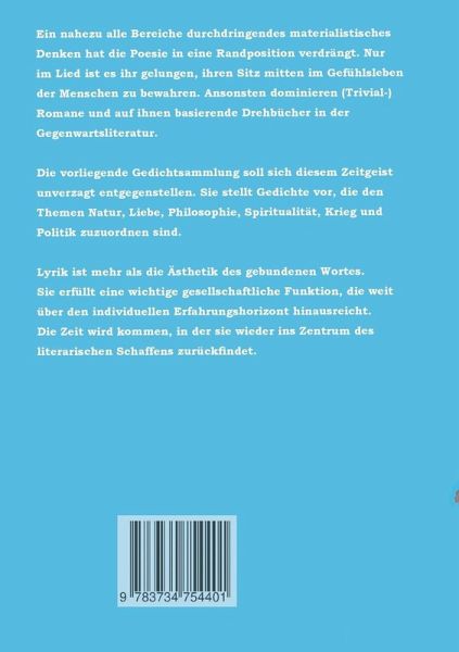 Ein nahezu alle Bereiche durchdringendes materialistisches Denken hat die Poesie in eine Randposition verdrängt. Nur im Lied ist es ihr gelungen, ihren Sitz mitten im Gefühlsleben der Menschen zu bewahren. Ansonsten dominieren (Trivial-)Romane und auf ihnen basierende Drehbücher in der Gegenwartsliteratur. Die vorliegende Gedichtsammlung soll sich diesem Zeitgeist unverzagt entgegenstellen. Sie stellt Gedichte vor, die den Themen Natur, Liebe, Philosophie, Spiritualität, Krieg und Politik zuzuordnen sind.Lyrik ist mehr als die Ästhetik des gebundenen Wortes. Sie erfüllt eine wichtige gesellschaftliche Funktion, die weit über den individuellen Lebenshorizont hinausreicht.Die Zeit wird kommen, in der sie wieder ins Zentrum des literarischen Schaffens zurückfindet.