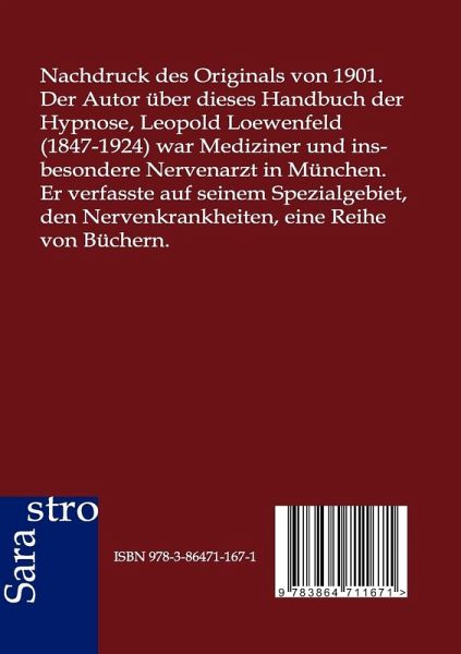 Nachdruck des Originals von 1901. Der Autor über dieses Handbuch der Hypnose, Leopold Loewenfeld (1847-1924) war Mediziner und insbesondere Nervenarzt in München. Er verfasste auf seinem Spezialgebiet, den Nervenkrankheiten, eine Reihe von Büchern.