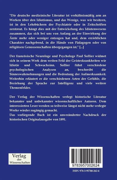 Der französische Neurologe und Psychologe Paul Sollier widmet sich in seinem Werk dem weiten Feld der Geisteskrankheiten wie Idiotie und Schwachsinn. Sollier führt verschiedene psychologischen Analysen an, beschreibt die Sinneswahrnehmungen und die Bedeutung der Aufmerksamkeit. Weiterhin erläutert er die verschiedenen Arten der Gefühle, die Beziehung der Sprache zur Intelligenz und viele weitere Themenfelder.