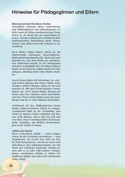 Als der Igel aus seinem Winterschlaf erwacht und sich putzt, fällt ihm ein Stachel aus. Erschrocken fragt er sich: "Wie viele Stacheln habe ich wohl noch auf meinem Rücken?" Im Wald trifft er auf verschiedene Tiere, u. a. einen Hasen, einen Fuchs und einen Hirsch, und fragt sie um Rat - doch kann jemand all seine Stacheln zählen?Dieses Bilderbuch führt auf jeder Seite eine Zahl von 1 bis 10 ein. Durch vielfältige Zählgelegenheiten unterstützt es Kinder im Alter von 3 bis 7 Jahren im Erwerb von Zählkompetenzen - dem ersten mathematischen Lerninhalt. Auch die Zerlegung von Zahlen, ein wichtiger Lernschritt bei der Entwicklung von Zahlkonzepten, wird thematisiert.Die pädagogischen Vorlesehinweise helfen Erwachsenen dabei, die Kinder in entspannter Atmosphäre beim Erwerb von Zählfertigkeiten zu unterstützen.
