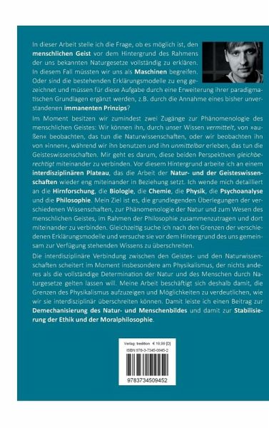 Die Naturwissenschaften zeichnen ein Bild der Welt, das sie vollständig durch Naturgesetze bestimmt und durch den Zufall gelenkt erscheinen lässt. Wie müssen wir uns im Rahmen dieses Bildes selbst begreifen? Unterscheiden wir uns nur durch die Komplexität unseres Gehirns von den Maschinen, die wir mit unseren Händen konstruieren? Haben wir tatsächlich bereits alle naturwissenschaftlichen Grundlagen erkennen können, die notwendig sind, um den menschlichen Geist im Prinzip vollständig zu erklären? Oder sind die bestehenden Erklärungsmodelle zu eng gezeichnet und müssen für diese Aufgabe durch eine Erweiterung ihrer paradigmatischen Grundlagen ergänzt werden, z.B. durch die Annahme eines bisher unverstandenen immanenten Prinzips? Im Moment besitzen wir zumindest zwei Zugänge zur Phänomenologie des menschlichen Geistes: Wir können ihn, durch unser Wissen vermittelt, von "außen" beobachten, das tun die Naturwissenschaften, oder wir beobachten ihn von "innen", während wir ihn benutzen und ihn unmittelbar erleben, das tun die Geisteswissenschaften. Der "Immanente Konstruktivismus" führt diese beiden Perspektiven gleichberechtigt zueinander. Er errichtet ein interdisziplinäres Plateau, das die Arbeit der Natur- und der Geisteswissenschaften wieder in eine dialektische Beziehung miteinander setzt. Er wendet sich detailliert an die Hirnforschung, die Biologie, die Chemie, die Physik, die Psychoanalyse und die Philosophie. Sein Ziel ist es, die grundlegenden Überlegungen der verschiedenen Wissenschaften, zur Phänomenologie der Natur und zum Wesen des menschlichen Geistes, im Rahmen der Philosophie zusammenzutragen und dort miteinander zu verbinden. Gleichzeitig sucht er nach den Grenzen der verschiedenen Erklärungsmodelle und versuche sie vor dem Hintergrund des gemeinsam zur Verfügung stehenden Wissens zu überschreiten. Damit leistet er einen Beitrag zur Demechanisierung des Naturbildes und damit zur Stabilisierung der Moralphilosophie.