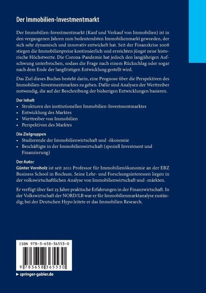 Der Immobilien-Investmentmarkt (Kauf und Verkauf von Immobilien) ist in den vergangenen Jahren zum bedeutendsten Immobilienmarkt geworden, der sich sehr dynamisch und innovativ entwickelt hat. Seit der Finanzkrise 2008 stiegen die Immobilienpreise kontinuierlich und erreichten jüngst neue historische Höchstwerte. Die Corona-Pandemie hat jedoch den langjährigen Aufschwung unterbrochen, sodass die Frage nach einem Rückschlag oder sogar nach dem Ende der langfristigen Entwicklung gestellt wird. Das Ziel dieses Buches besteht darin, eine Prognose über die Per spektiven des Immobilien-Investmentmarktes zu geben. Dafür sind Analysen der Werttreiber notwendig, die auf der Beschreibung der bisherigen Entwicklungen basieren.