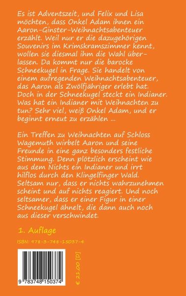 Es ist Adventszeit, und Felix und Lisa möchten, dass Onkel Adam ihnen ein Aaron-Ginster-Weihnachtsabenteuer erzählt. Weil nur er die dazugehörigen Souvenirs im Krimskramszimmer kennt, wollen sie diesmal ihm die Wahl überlassen. Da kommt nur die barocke Schneekugel in Frage. Sie handelt von einem aufregenden Weihnachtsabenteuer, das Aaron als Zwölfjähriger erlebt hat. Doch in der Schneekugel steckt ein Indianer. Was hat ein Indianer mit Weihnachten zu tun? Sehr viel, weiß Onkel Adam, und er beginnt erneut zu erzählen ... Ein Treffen zu Weihnachten auf Schloss Wagemuth wirbelt Aaron und seine Freunde in eine ganz besonders festliche Stimmung. Denn plötzlich erscheint wie aus dem Nichts ein Indianer und irrt hilflos durch den Klingelfinger Wald. Seltsam nur, dass er nichts wahrzunehmen scheint und auf nichts reagiert. Und noch seltsamer, dass er einer Figur in einer Schneekugel ähnelt, die dann auch noch aus dieser verschwindet.