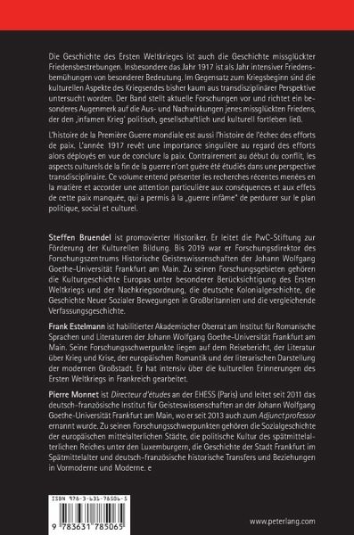 Die Geschichte des Ersten Weltkrieges ist auch die Geschichte missglückter Friedensbestrebungen. Insbesondere das Jahr 1917 ist als Jahr intensiver Friedensbemühungen von besonderer Bedeutung. Im Gegensatz zum Kriegsbeginn sind die kulturellen Aspekte des Kriegsendes bisher kaum aus transdisziplinärer Perspektive untersucht worden. Der Band stellt aktuelle Forschungen vor und richtet ein besonderes Augenmerk auf die Aus- und Nachwirkungen jenes missglückten Friedens, der den 'infamen Krieg' politisch, gesellschaftlich und kulturell fortleben ließ.