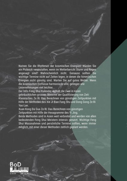 Nutzen Sie die Rhythmen der kosmischen Energien! Würden Sie ein Picknick veranstalten, wenn im Wetterbericht Sturm und Regen angesagt sind? Wahrscheinlich nicht. Genauso sollten Sie wichtige Termine nicht auf Zeiten legen, in denen die himmlischen Energien nicht günstig sind. Warten Sie auf gutes Wetter. Wenn die kosmischen Einflüsse harmonisch sind, gelingen alle Unternehmungen viel leichter.Der Infis Feng Shui Kalender enthält die zwei in Asien gebräuchlichen grossen Systeme der Qualifizierung von Zeit:Klassisches Ze Ri: Das Berechnen von günstigen Zeitpunkten mit Hilfe der Methoden des Xie Ji Bian Fang Shu und Dong Gong Ze Ri Yao Lan.Xuan Kong Da Gua Ze Ri: Das Berechnen von günstigen Zeitpunkten mit Hilfe der Hexagramme des Yi Jing.Beide Methoden sind in Asien weit verbreitet und werden von allen bedeutenden Feng Shui Meistern intensiv genutzt. Wichtige Feng Shui Massnahmen und persönliche Termine sollten, wenn immer möglich, mit einer dieser Methoden zeitlich geplant werden.