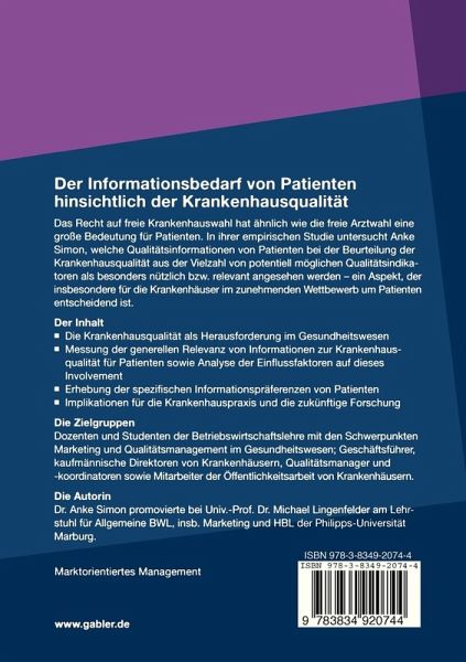 Die Beurteilung der Krankenhausqualität als Herausforderung im Gesundheitswesen.- Die Hintergründe für die zunehmende Diskussion über Qualitätsinformationen im Krankenhaussektor.- Der Untersuchungskontext der vorliegenden Arbeit.- Die Grundlagen der Untersuchung.- Die Konzeption der empirischen Untersuchung.- Das Involvement von Patienten hinsichtlich Informationen zur Krankenhausqualität.- Die Determinanten des Involvements von Patienten hinsichtlich Informationen zur Krankenhausqualität.- Die Informationspräferenzen von Patienten zur Krankenhausqualität.- Die Zusammenfassende Bewertung der Untersuchung.