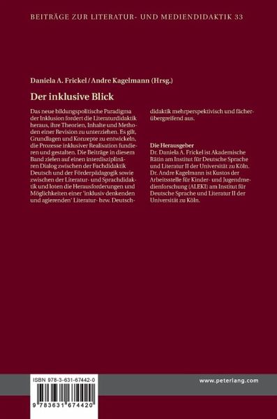 Daniela A. Frickel und Andre Kagelmann: Der inklusive Blick: Die Literaturdidaktik und ein neues Paradigma - Grundlagen inklusiver (Deutsch-)Didaktik - Gerhard Rupp: Der inklusive Blick auf das Lernen von Sprache, Literatur und den Umgang mit Medien - kulturwissenschaftliche Perspektiven auf die Deutschdidaktik - Ralph Olsen: Lust, Niemandes Schlaf zu sein ... Anmerkungen zur Problematik der Textauswahl im inklusiven Literaturunterricht - Tilman von Brand: Literarisches Lernen in inklusiven Lerngruppen - Eckpunkte einer inklusiven Literaturdidaktik - Kerstin Ziemen: Inklusive Didaktik - Herausforderungen und Perspektiven - Tobias Bernasconi und Mara Wittenhorst: Elementarisierung als didaktische Moglichkeit zur Gestaltung von inklusivem Literaturunterricht - Perspektiven aus Sicht des Forderschwerpunktes Geistige Entwicklung - Diana Gebele und Alexandra L. Zepter: Inklusive Brucken zwischen Literatur- und Sprachdidaktik - Christiane Hochstadt: "Sprache ist nicht, das sie das Fremde abweist" -Sprachdidaktik und Inklusion - Literatur und Medien als Gegenstand im inklusiven Literaturunterricht - Iris Kruse: Kinderliterarische Medienverbunde im inklusiven Literaturunterricht der Grundschule - Mediale Darstellungsvielfalt als Chance fur gemeinsame literarasthetische Erfahrungen - Ingo Bosse: Filmbildung als Aufgabe einer sich entwickelnden inklusiven (Literatur-)Didaktik - eine Standortbestimmung - Cornelius Herz: Story grammars im inklusiven Deutschunterricht. Narratologische Konzeptionen am Beispiel KJL-affiner Text- und Filmformate Literarisches Lernen fur alle - literarasthetisch anspruchsvolle Texte im inklusiven Unterricht: eine Problemskizze - Kathrin Ulbricht, Lars Krüger, Stefanie Schick und Mona Bektesi: Ein Setting fur inklusiven Literaturunterricht an der Obersch - Peter Conrady:Lernlandschaften entwickeln und gestalten - Berbeli Wanning: Die 'Teufelskinder'. Uber den Zusammenhang von Behinderung und Stigma - Inklusiver Literaturunterricht -Forderansatze und Professionalisierung- Petra Anders und Judith RiegertProfessionalisierung durch Kooperation am Beispiel der Leseforderung im inklusiven Deutschunterricht - Daniela Merklinger und Ulrike PreußerSchreibdidaktische Konzeptionen fur eine Literaturdidaktik im Kontext von Inklusion - Angelika Thäle: Teamteaching im inklusiven Literaturunterricht - Andreas Barnieske und Andreas SeidlerPotentiale und Herausforderungen kooperativer Leseforderprogramme aus inklusiver Perspektive - Nana Eger:Wie kann diversitatsorientierte Kulturelle Bildung in Schule gelingen? - Verzeichnis der Autorinnen und Autoren
