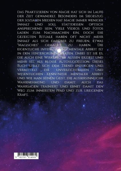 Das Praktizieren von Magie hat sich im Laufe der Zeit gewandelt. Besonders im Siegeszug der sozialen Medien hat Magie immer weniger Inhalt und soll stattdessen optisch ansprechend sein. Viele Videos und Fotos laden zum Nachmachen ein, doch die gezeigten Rituale haben oft nicht mehr Inhalt als sich darüber zu freuen, etwas "Magisches" gemacht zu haben. Die eigentliche intensive und mentale Arbeit ist in den Hintergrund geraten. Dabei ist sie es, die auch eine Wirkung im Außen erzielt und mehr ist, als bloße Autosuggestion. Dieses Buch stellt sich dem Trend entgegen und vermittelt die unverzichtbaren und wesentlichen Kenntnisse mentaler Arbeit und wie man seinen Geist, die außersinnliche Wahrnehmung und damit auch das Wahrsagen trainiert und ebnet damit den Weg zum innersten Pfad und zur ureigenen Kraft.