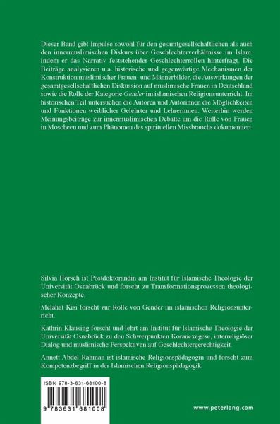 Dieser Band gibt Impulse sowohl für den gesamtgesellschaftlichen als auch den innermuslimischen Diskurs über Geschlechterverhältnisse im Islam, indem er das Narrativ feststehender Geschlechterrollen hinterfragt. Die Beiträge analysieren u.a. historische und gegenwärtige Mechanismen der Konstruktion muslimischer Frauen- und Männerbilder, die Auswirkungen der gesamtgesellschaftlichen Diskussion auf muslimische Frauen in Deutschland sowie die Rolle der Kategorie Gender im islamischen Religionsunterricht. Im historischen Teil untersuchen die Autoren und Autorinnen die Möglichkeiten und Funktionen weiblicher Gelehrter und Lehrerinnen. Weiterhin werden Meinungsbeiträge zur innermuslimischen Debatte um die Rolle von Frauen in Moscheen und zum Phänomen des spirituellen Missbrauchs dokumentiert.