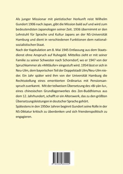 Als junger Missionar mit pietistischer Herkunft reist Wilhelm Gundert 1906 nach Japan, gibt die Mission bald auf und wird zum bedeutendsten Japanologen seiner Zeit. 1936 übernimmt er den Lehrstuhl für Sprache und Kultur Japans an der NS-Universität Hamburg und dient in verschiedenen Funktionen dem nationalsozialistischen Staat. Nach der Kapitulation am 8. Mai 1945 Entlassung aus dem Staatsdienst ohne Anspruch auf Ruhegeld. Mittellos zieht er mit seiner Familie zu seiner Schwester nach Schorndorf, wo er 1947 von der Spruchkammer als »Mitläufer« eingestuft wird. 1954 lässt er sich in Neu-Ulm, dem bayerischen Teil der Doppelstadt Ulm/Neu-Ulm nieder. Ein Jahr später wird ihm von der Universität Hamburg die Rechtsstellung eines emeritierten Ordinarius mit Pensionsanspruch zuerkannt. Mit der teilweisen Übersetzung des »Bi-yän-lu«, eines chinesischen Grundlagenwerkes des Zen-Buddhismus aus dem 12. Jahrhundert, schafft er ein Alterswerk, das zu den größten Übersetzungsleistungen in deutscher Sprache gehört. Spätestens in den 1950er Jahren beginnt Gundert seine Rolle in der NS-Diktatur kritisch zu überdenken und sich friendenspolitisch zu engagieren.