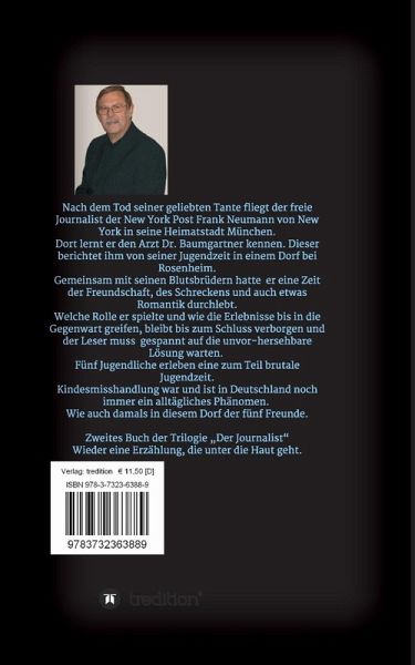 Nach dem Tod seiner geliebten Tante fliegt der freie Journalist der New York Post Frank Neumann von New York in seine Heimatstadt München.Dort lernt er den Arzt Dr. Baumgartner kennen. Dieser berichtet ihm von seiner Jugendzeit in einem Dorf bei Rosenheim.Gemeinsam mit seinen Blutsbrüdern hatte er eine Zeit der Freundschaft, des Schreckens und auch etwas Romantik durchlebt.Welche Rolle er spielte und wie die Erlebnisse bis in die Gegenwart greifen, bleibt bis zum Schluss verborgen und der Leser muss gespannt auf die unvor-hersehbare Lösung warten. Fünf Jugendliche erleben eine zum Teil brutale Jugendzeit.Kindesmisshandlung war und ist in Deutschland noch immer ein alltägliches Phänomen. Wie auch damals in diesem Dorf der fünf Freunde.Zweites Buch der Trilogie "Der Journalist"Wieder eine Erzählung, die unter die Haut geht.