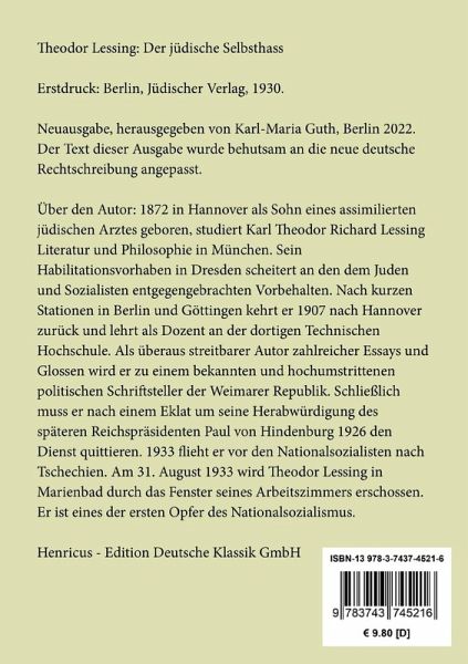 Theodor Lessing: Der jüdische SelbsthassErstdruck: Berlin, Jüdischer Verlag, 1930. Die Zahlen in eckigen Klammern im Texte beziehen sich auf die Anmerkungen am Schlusse des Buches.Neuausgabe, herausgegeben von Karl-Maria Guth, Berlin 2023.Der Text dieser Ausgabe wurde behutsam an die neue deutsche Rechtschreibung angepasst.Umschlagabbildung: Theodor Lessing, fotografiert von Will Burgdorf, um 1930Gesetzt aus der Minion Pro, 11 pt.Die Sammlung Hofenberg erscheint im Verlag Henricus - Edition Deutsche Klassik GmbH, BerlinÜber den Autor:1872 in Hannover als Sohn eines assimilierten jüdischen Arztes geboren, studiert Karl Theodor Richard Lessing Literatur und Philosophie in München. Sein Habilitationsvorhaben in Dresden scheitert an den dem Juden und Sozialisten entgegengebrachten Vorbehalten. Nach kurzen Stationen in Berlin und Göttingen kehrt er 1907 nach Hannover zurück und lehrt als Dozent an der dortigen Technischen Hochschule. Als überaus streitbarer Autor zahlreicher Essays und Glossen wird er zu einem bekannten und hochumstrittenen politischen Schriftsteller der Weimarer Republik. Schließlich muss er nach einem Eklat um seine Herabwürdigung des späteren Reichspräsidenten Paul von Hindenburg 1926 den Dienst quittieren. 1933 flieht er vor den Nationalsozialisten nach Tschechien. Am 31. August 1933 wird Theodor Lessing in Marienbad durch das Fenster seines Arbeitszimmers erschossen. Er ist eines der ersten Opfer des Nationalsozialismus.