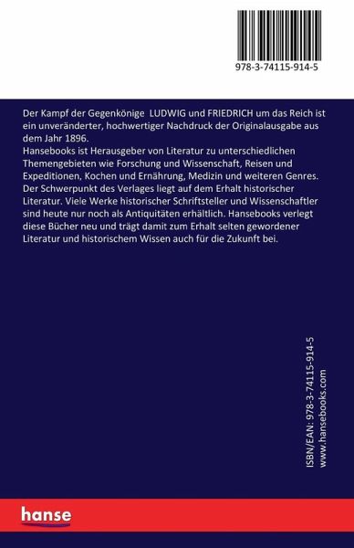 Der Kampf der Gegenkönige LUDWIG und FRIEDRICH um das Reich ist ein unveränderter, hochwertiger Nachdruck der Originalausgabe aus dem Jahr 1896.Hansebooks ist Herausgeber von Literatur zu unterschiedlichen Themengebieten wie Forschung und Wissenschaft, Reisen und Expeditionen, Kochen und Ernährung, Medizin und weiteren Genres. Der Schwerpunkt des Verlages liegt auf dem Erhalt historischer Literatur. Viele Werke historischer Schriftsteller und Wissenschaftler sind heute nur noch als Antiquitäten erhältlich. Hansebooks verlegt diese Bücher neu und trägt damit zum Erhalt selten gewordener Literatur und historischem Wissen auch für die Zukunft bei.